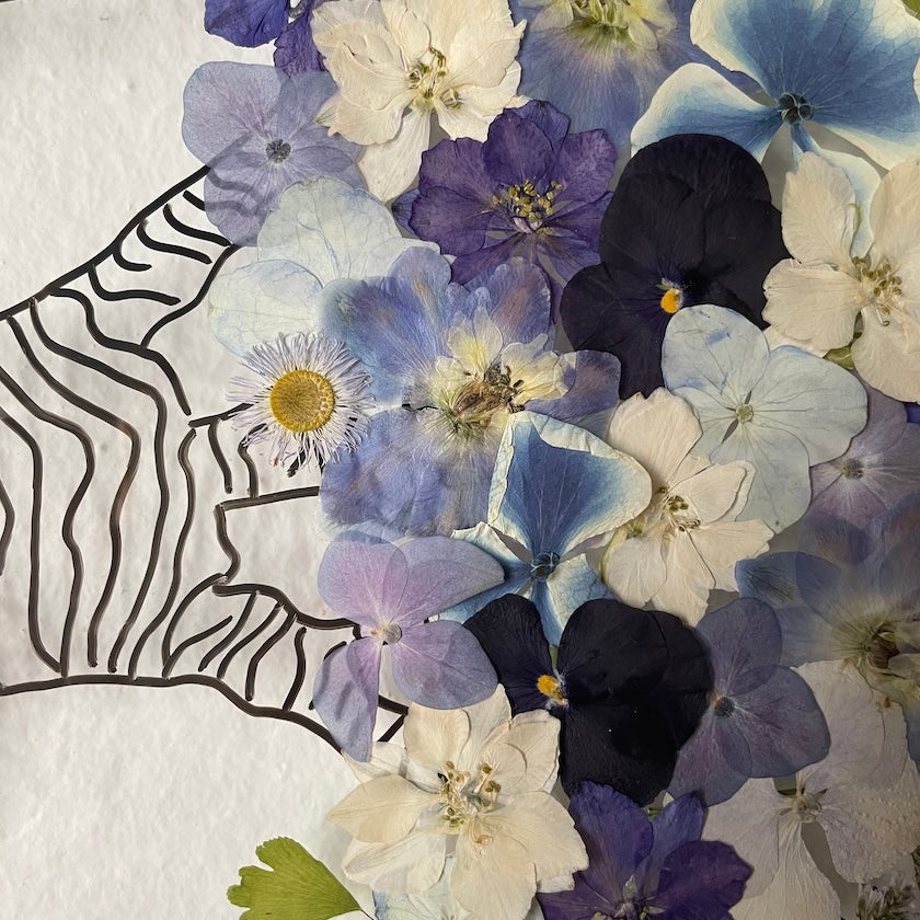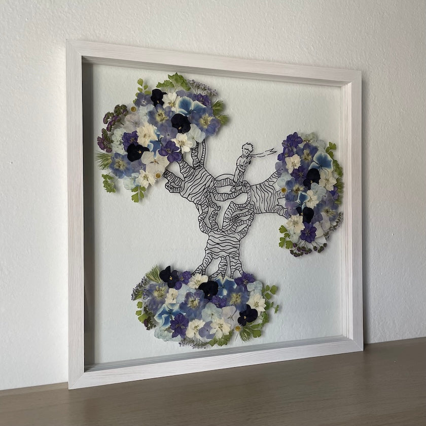 Květinový ručně vyrobený obraz s originální malovanou siluetou Malého prince s květy v modrých a bílých barvách.
