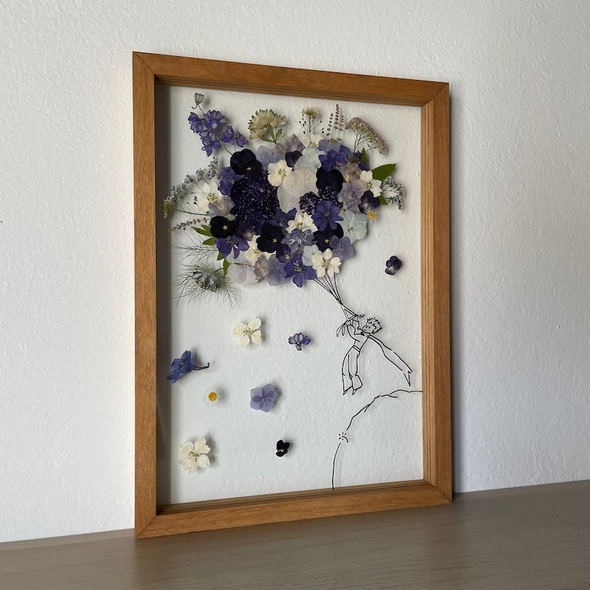 Květinový ručně vyrobený obraz s originální malovanou siluetou Malého prince s květy v modrých a bílých barvách.