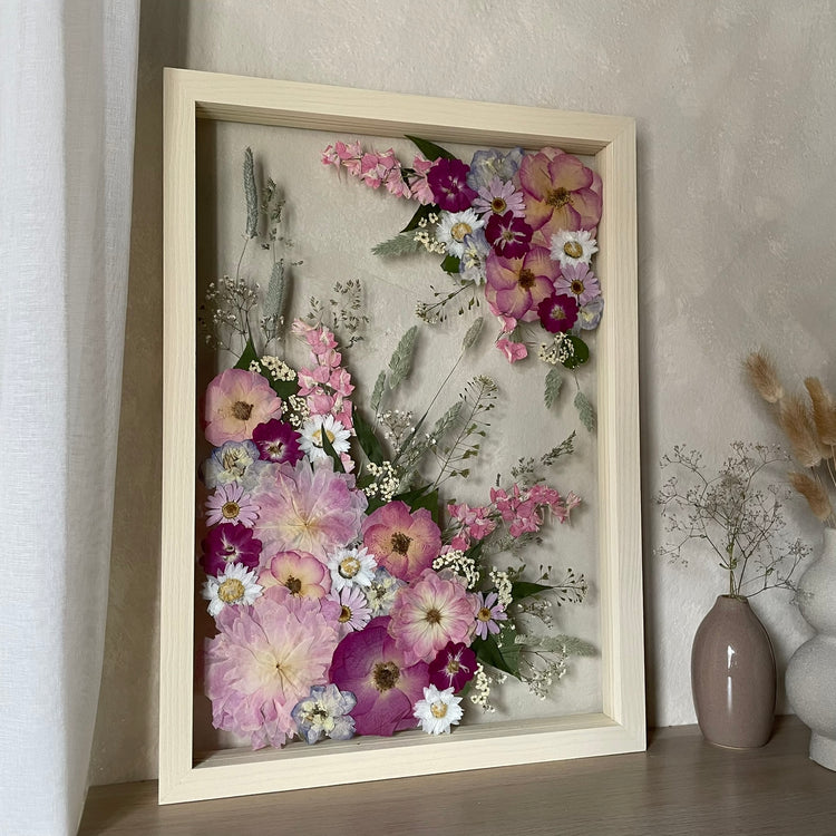 Květiny jsou zasazeny mezi skla a doplněny ručně vyráběným dřevěným rámem, který vzniká přímo v naší dílně. 🪵