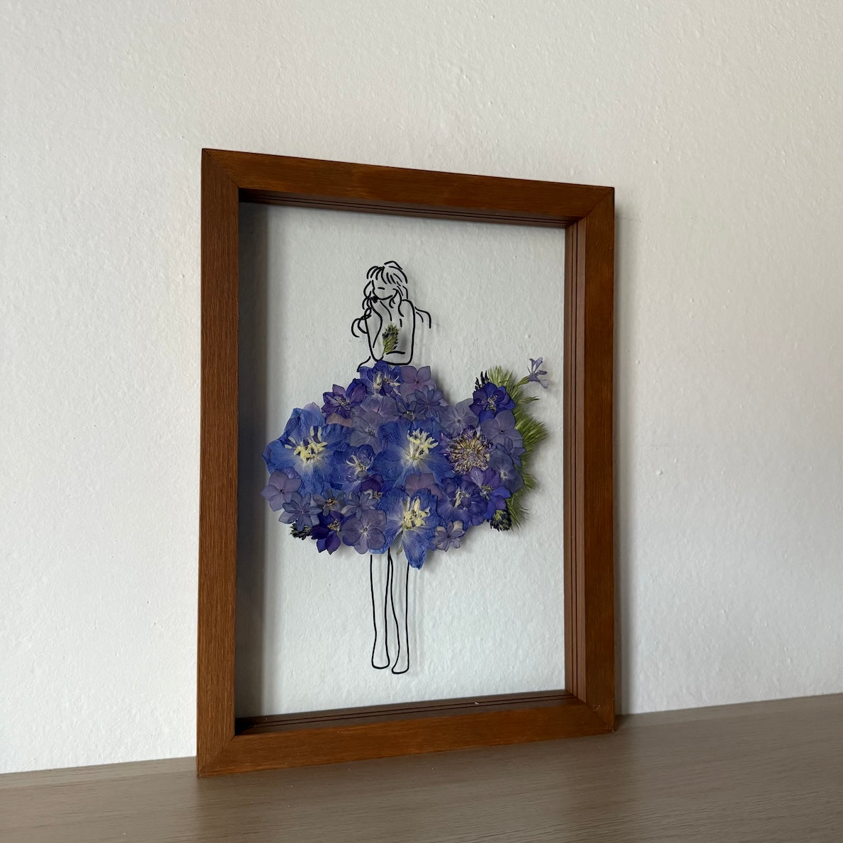 Květinový ručně vyrobený obraz s originální malovanou siluetou s květy v modrých barvách.