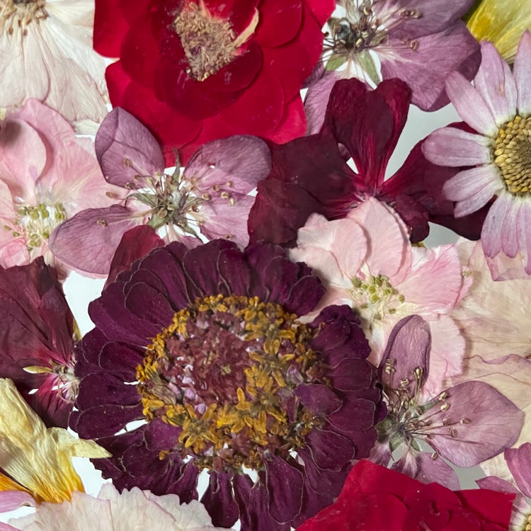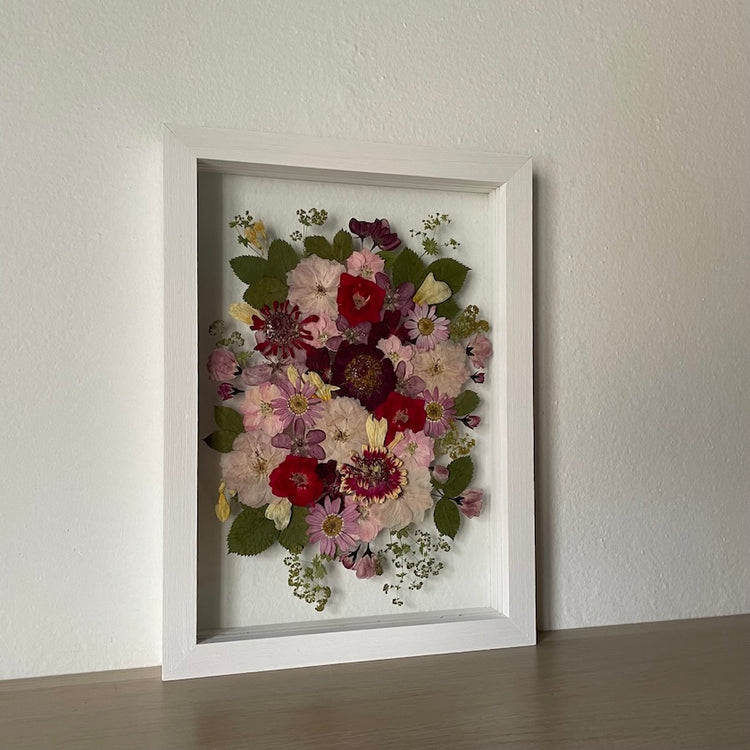 Květinový ručně vyrobený obraz s květy v růžových, červených a fialových barvách, které rostou ze středu obrazu. Mezi květy najdete růže, květy třešní, cínie a mnoho dalšího.