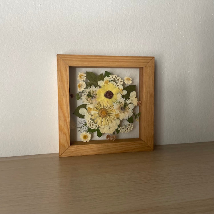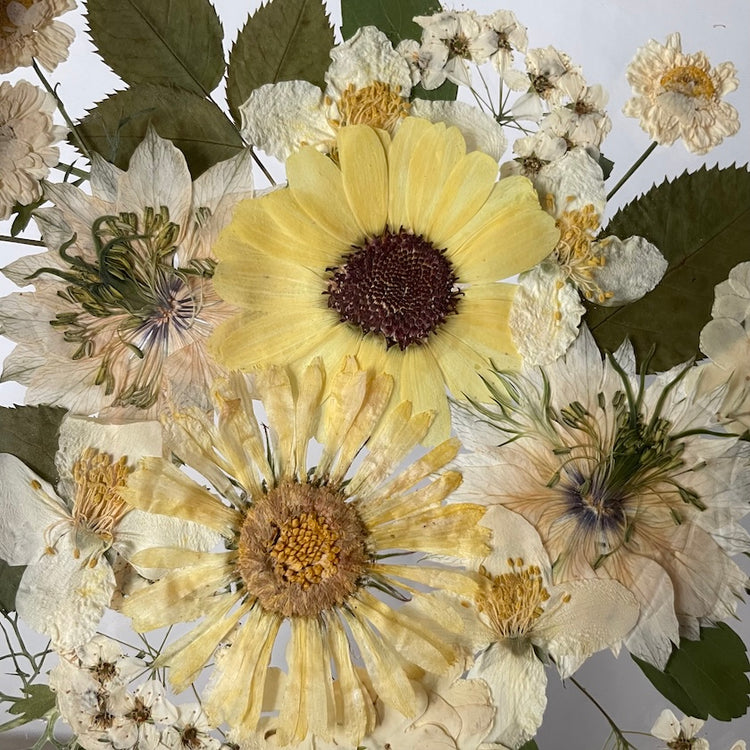 Květinový ručně vyrobený obraz s květy žlutých a bílých barviček, které rostou ze středu obrazu. Mezi květy najdete černuchy, měsíčky, jasmín a mnoho dalšího.
