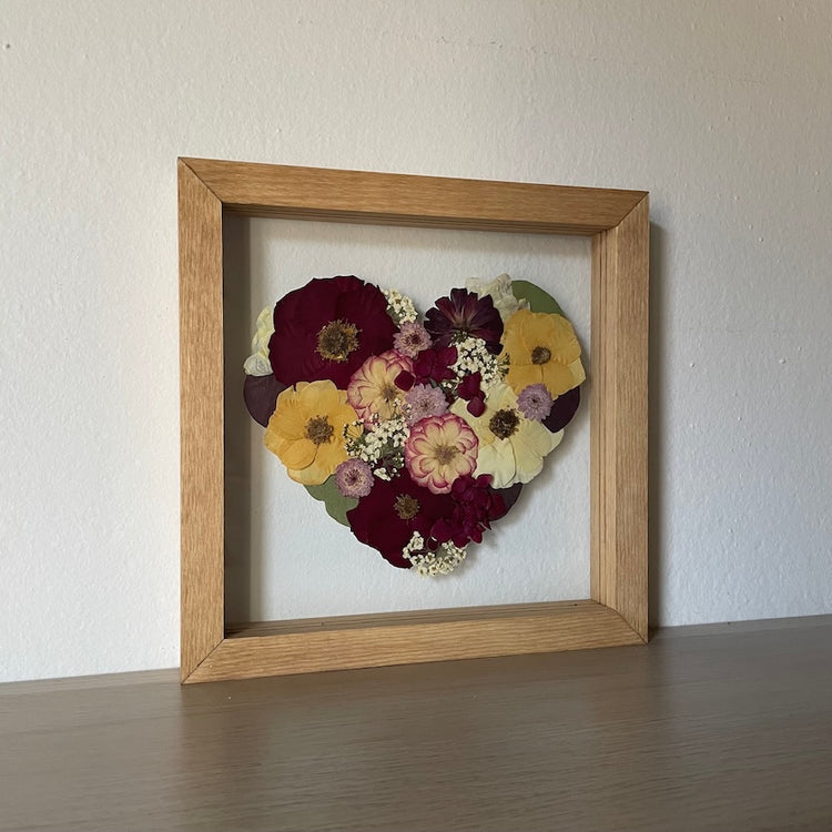 Květiny jsou zasazeny mezi skla a doplněny ručně vyráběným dřevěným rámem, který vzniká přímo v naší dílně. 🪵