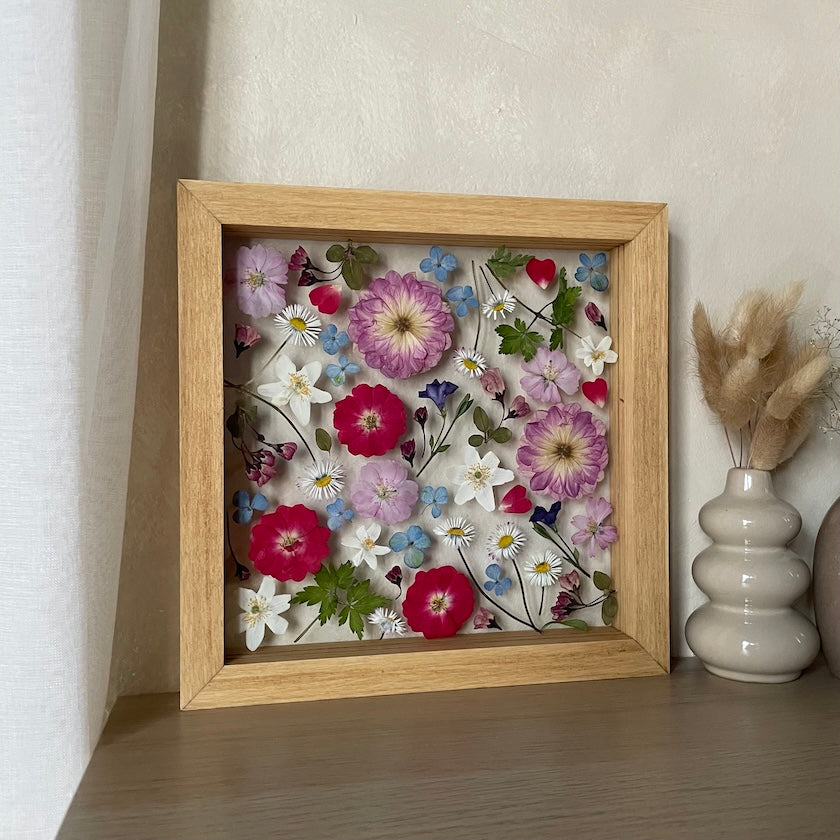 Květiny jsou zasazeny mezi skla a doplněny ručně vyráběným dřevěným rámem, který vzniká přímo v naší dílně. 🪵