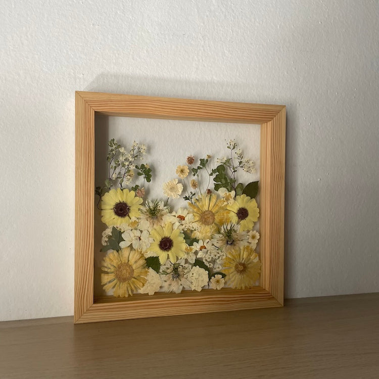 Květinový ručně vyrobený obraz s květy ve žlutých a bílých barvách, které rostou ze spodu obrazu. Mezi květy najdete měsíčky, jasmín a mnoho dalšího.