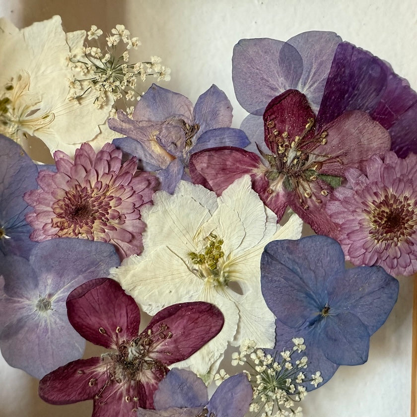 Květinový ručně vyrobený obraz s květy bílých, fialových a modrých barviček, které rostou ve tvaru srdce ze středu obrazu. Mezi květy najdete květy třešní, hortenzie, ostrožky a mnoho dalšího.