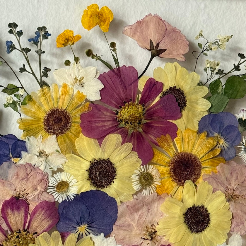Použité květiny a rostliny jsou skutečné, ručně sbírané a šetrně lisované, aby si zachovaly svou přirozenou strukturu, jemnost i barevnost. 🌿 Následně jsou s citem aranžovány do jedinečné kompozice – každý obraz je originál, žádné dva kusy nejsou stejné.
