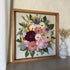 Květinový ručně vyrobený obraz s květy v růžových, červených a bílých barvách, které rostou ze středu obrazu. Mezi květy najdete pivoňku, květy třešní, růže a mnoho dalšího.