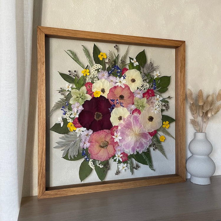 Květiny jsou zasazeny mezi skla a doplněny ručně vyráběným dřevěným rámem, který vzniká přímo v naší dílně. 🪵
