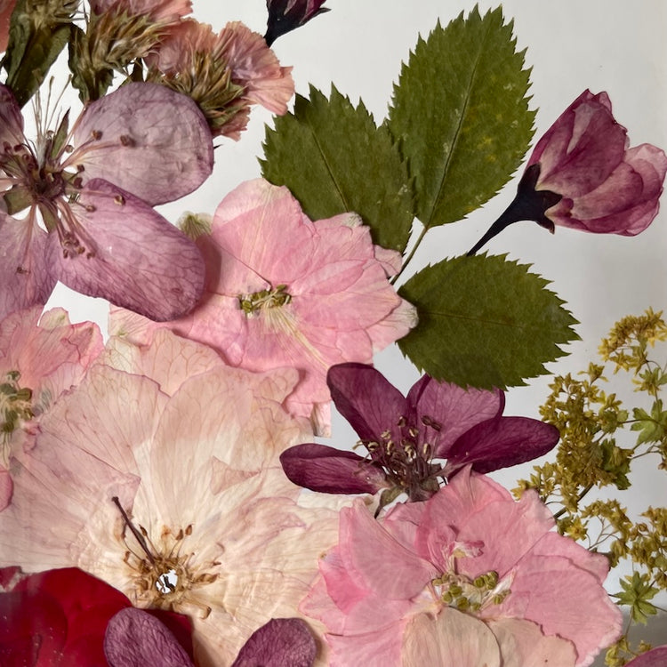 Květinový ručně vyrobený obraz s květy růžových a bílých barev, které rostou z rohu obrazu. Mezi květy najdete ostrožku, květy třešní a mnoho dalšího.