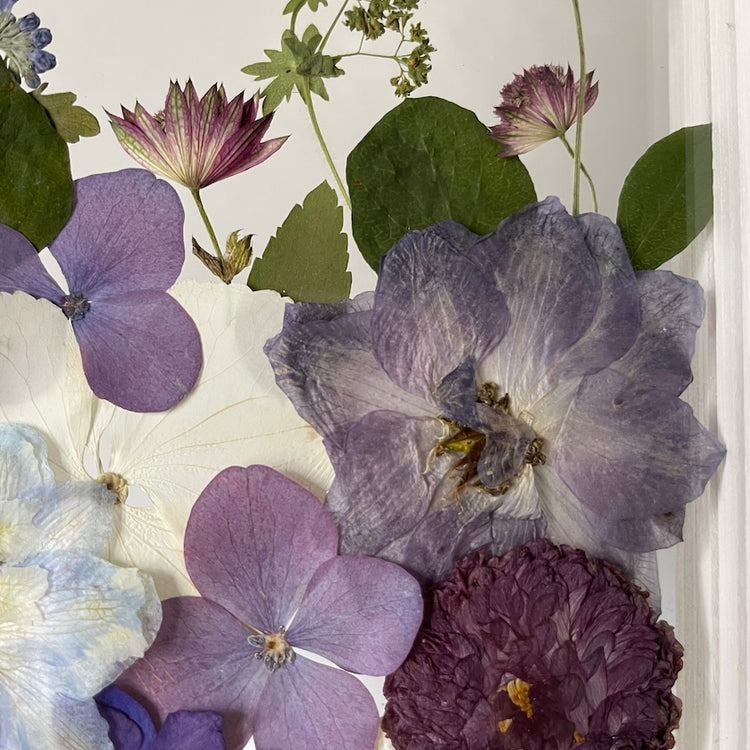Květinový ručně vyrobený obraz s květy bílých a modrých a fialových barev, které rostou ze spodu obrazu. Mezi květy najdete hortenzii, ostrožky, krásenky a další.