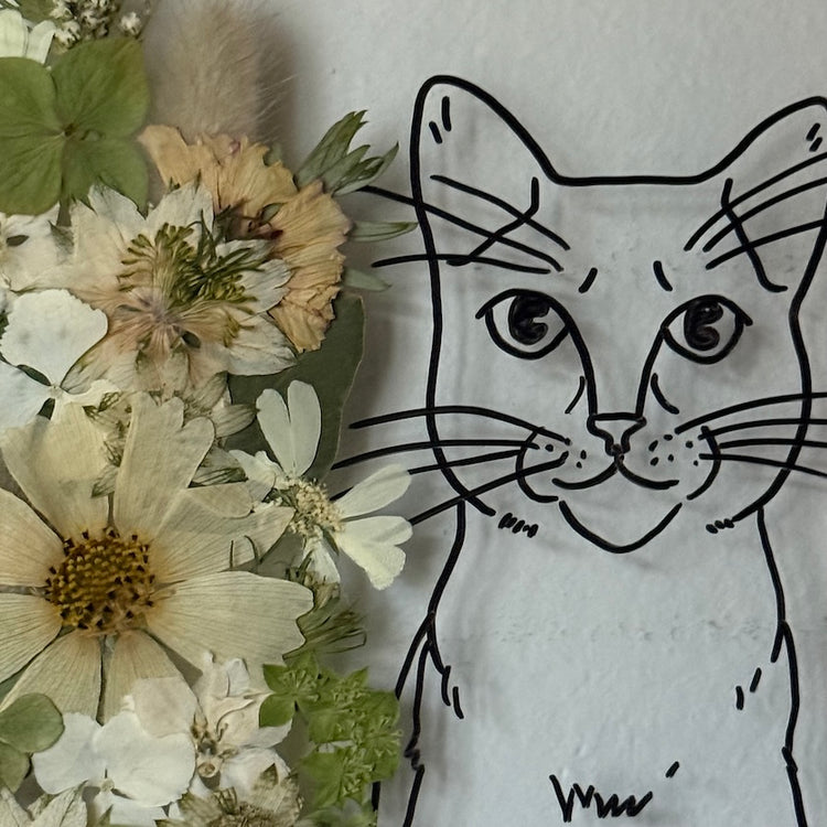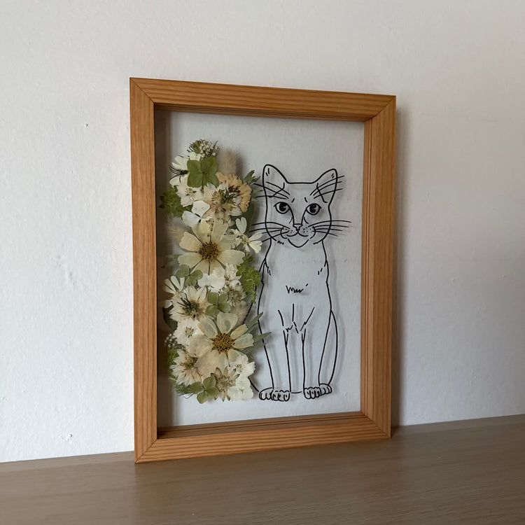 Květinový ručně vyrobený obraz s ručně nakreslenou siluetou zvířátka. Kočka s ocáskem z pravých květů zahřeje u srdce každého milovníka zvířecí a květinové říše. Pro malé i velké.