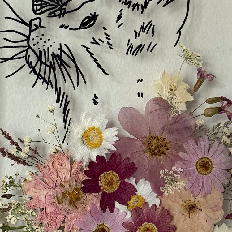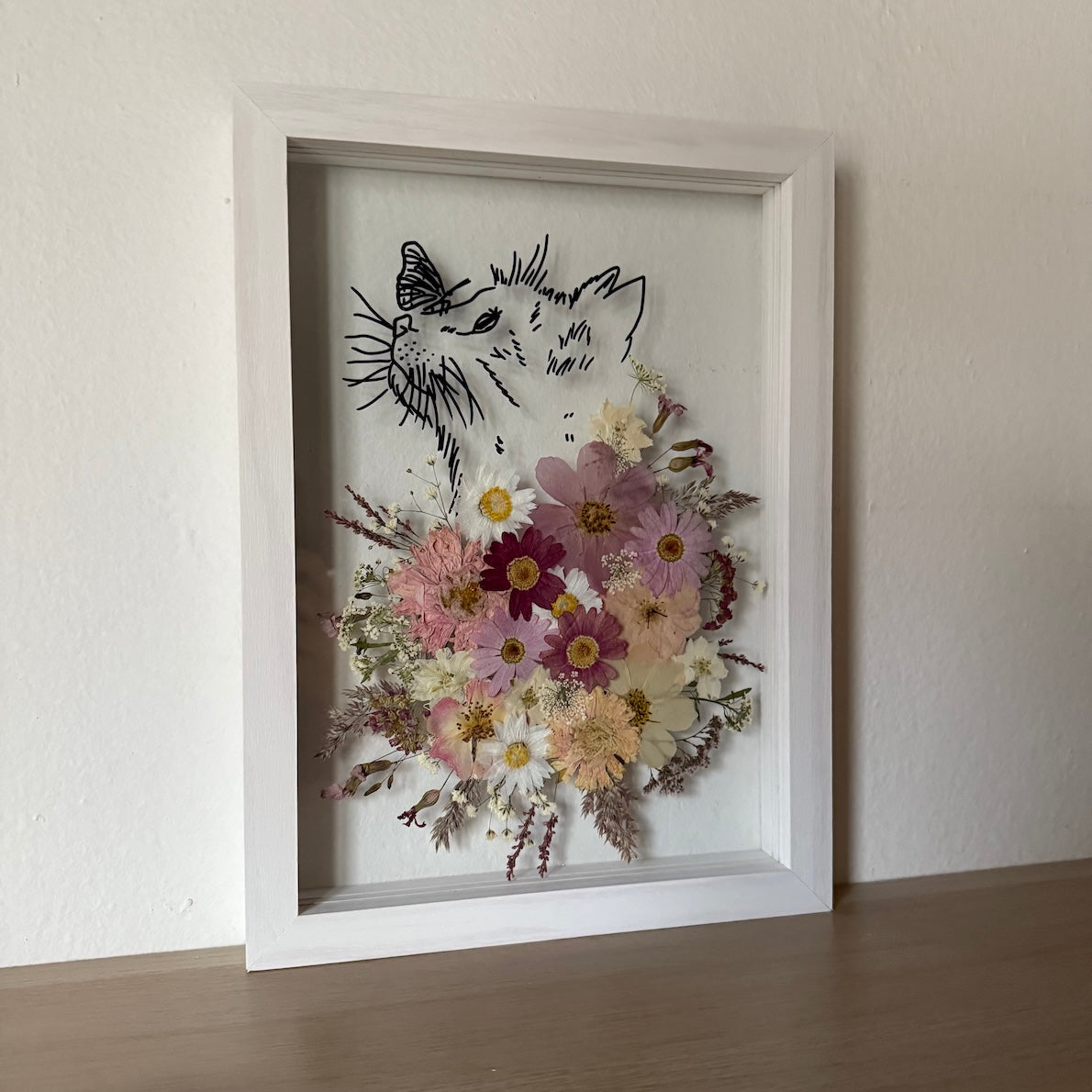 Květinový ručně vyrobený obraz s ručně nakreslenou siluetou zvířátka. Kočka z pravých květů zahřeje u srdce každého milovníka zvířecí a květinové říše. Pro malé i velké.