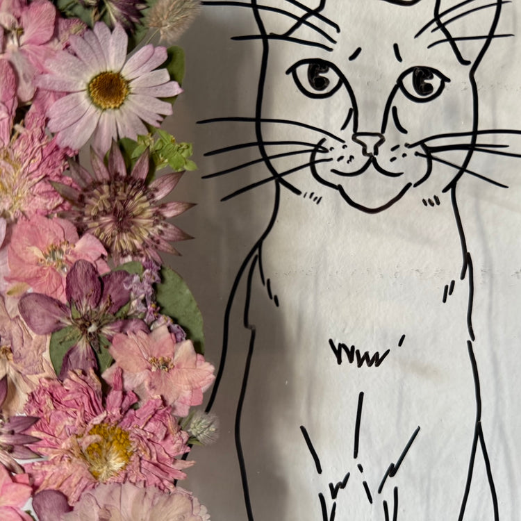 Květinový ručně vyrobený obraz s ručně nakreslenou siluetou zvířátka. Kočka s ocáskem z pravých květů zahřeje u srdce každého milovníka zvířecí a květinové říše. Pro malé i velké.