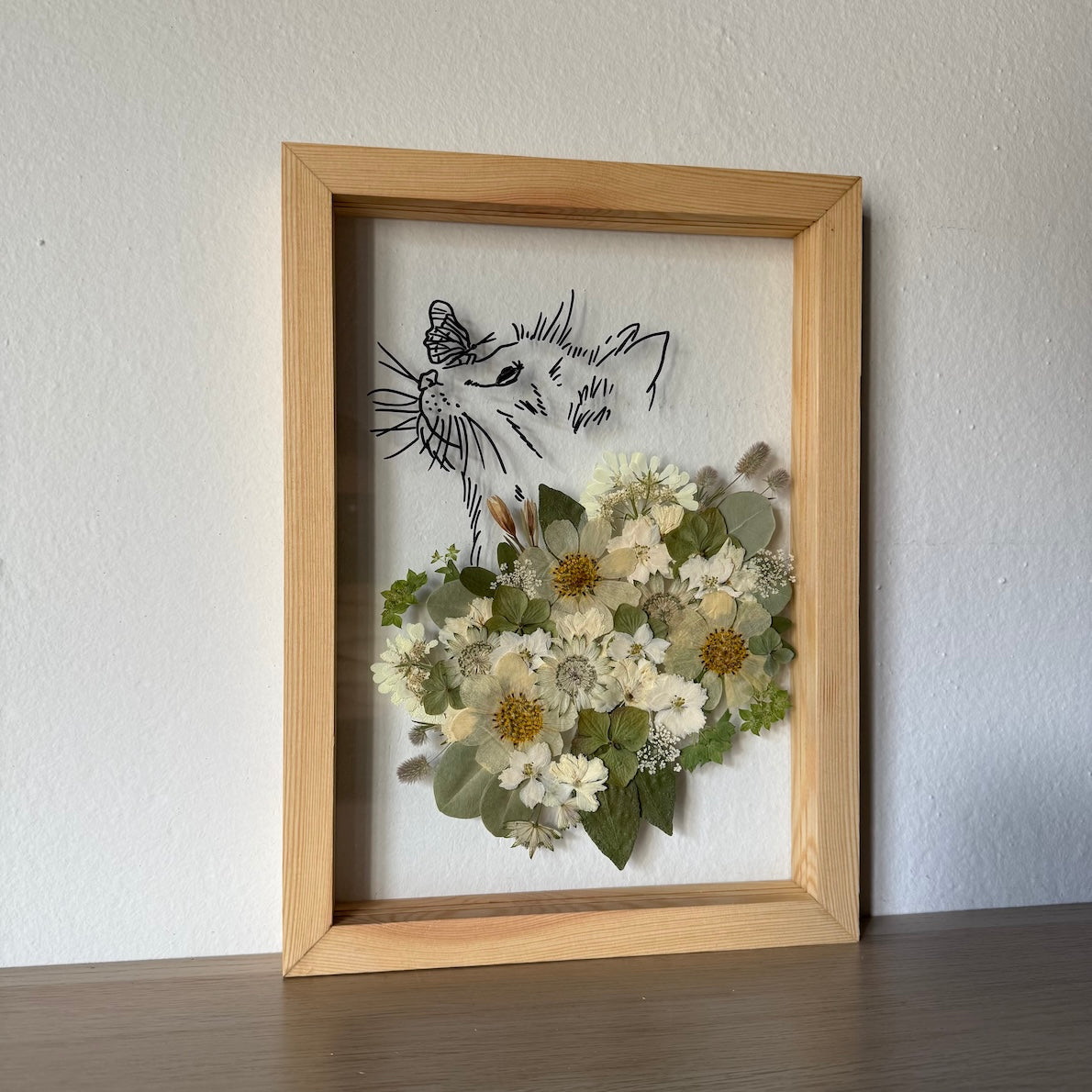 Květinový ručně vyrobený obraz s ručně nakreslenou siluetou zvířátka. Kočka z pravých květů zahřeje u srdce každého milovníka zvířecí a květinové říše. Pro malé i velké.