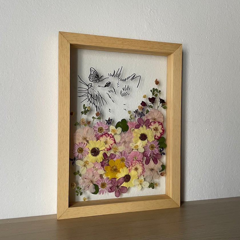 Květinový ručně vyrobený obraz s ručně nakreslenou siluetou zvířátka. Kočka na rozkvetlé louce z pravých květů zahřeje u srdce každého milovníka zvířecí a květinové říše. Pro malé i velké.