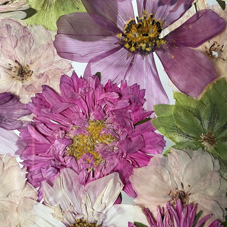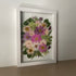 Květinový ručně vyrobený obraz s květy v růžových a fialových barvách, které rostou ze středu obrazu. Mezi květy najdete krásenky, čemeřice, květy třešní a mnoho dalšího.