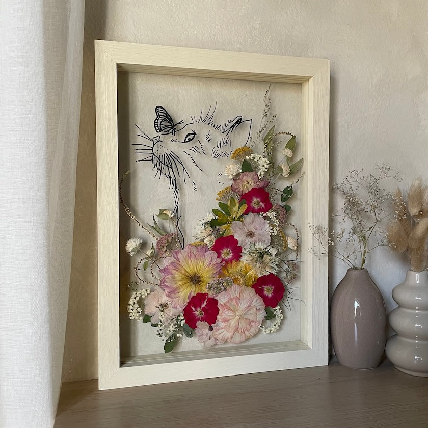 Květinový ručně vyrobený obraz s ručně nakreslenou siluetou zvířátka. Kočička z pravých květů zahřeje u srdce každého milovníka zvířecí a květinové říše. Pro malé i velké.
