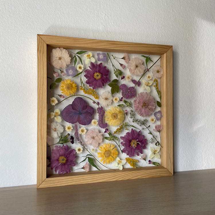 Květinový ručně vyrobený obraz s květy ve žlutých, růžových a fialových barvách, které rostou po celém obrazu. Mezi květy najdete měsíčky, květy růží, hortenzie a mnoho dalšího.