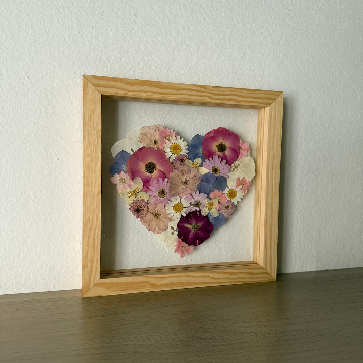 Květinový ručně vyrobený obraz s květy v bílých, růžových a modrých barvách, které rostou do tvaru srdce. Mezi květy najdete květy třešní, růže a mnoho dalšího.