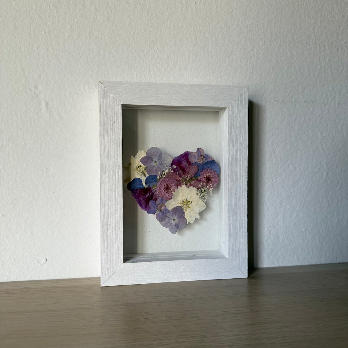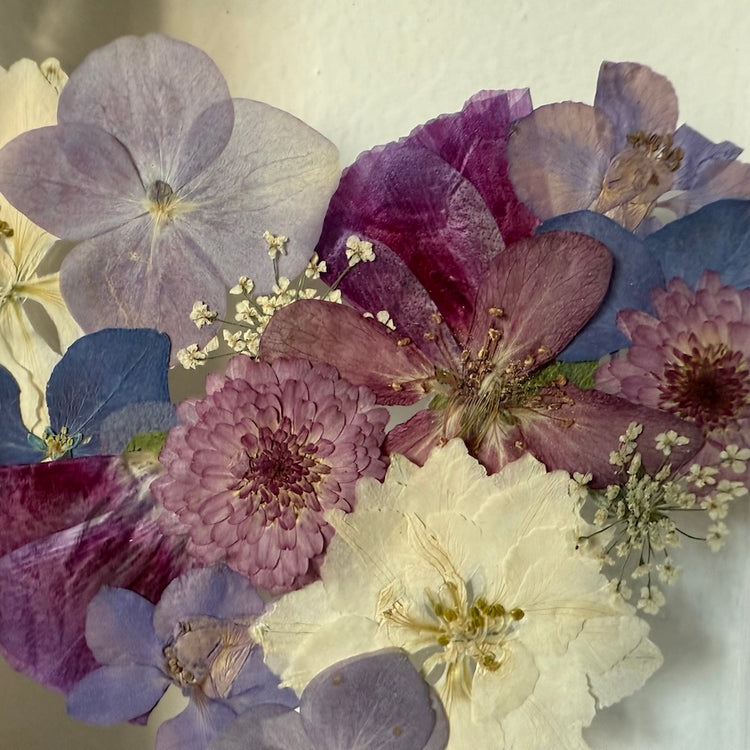 Květinový ručně vyrobený obraz s květy bílých, fialových a modrých barviček, které rostou ve tvaru srdce ze středu obrazu. Mezi květy najdete květy třešní, hortenzie, ostrožky a mnoho dalšího.