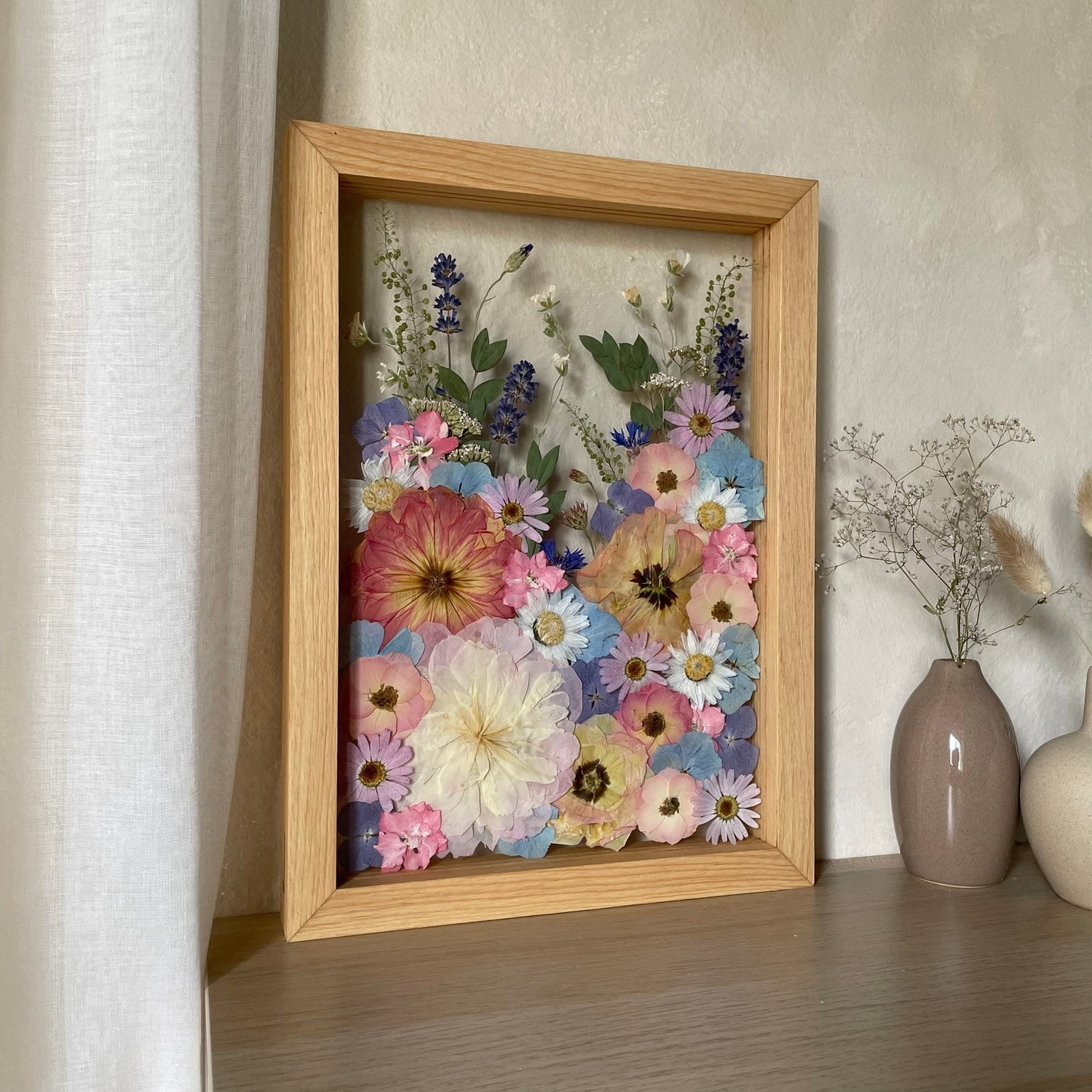 Použité květiny a rostliny jsou skutečné, ručně sbírané a šetrně lisované, aby si zachovaly svou přirozenou strukturu, jemnost i barevnost. 🌿 Následně jsou s citem aranžovány do jedinečné kompozice – každý obraz je originál, žádné dva kusy nejsou stejné.