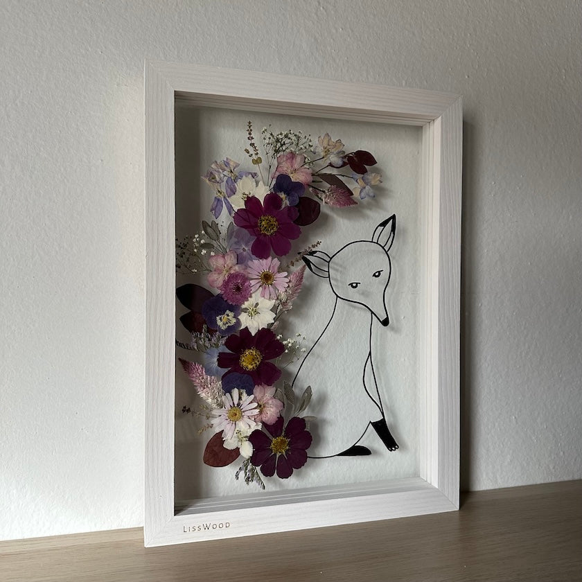 Květinový ručně vyrobený obraz s ručně nakreslenou siluetou zvířátka. Liška s rozkvetlým ocasem z pravých květů zahřeje u srdce každého milovníka zvířecí a květinové říše. Pro malé i velké.
