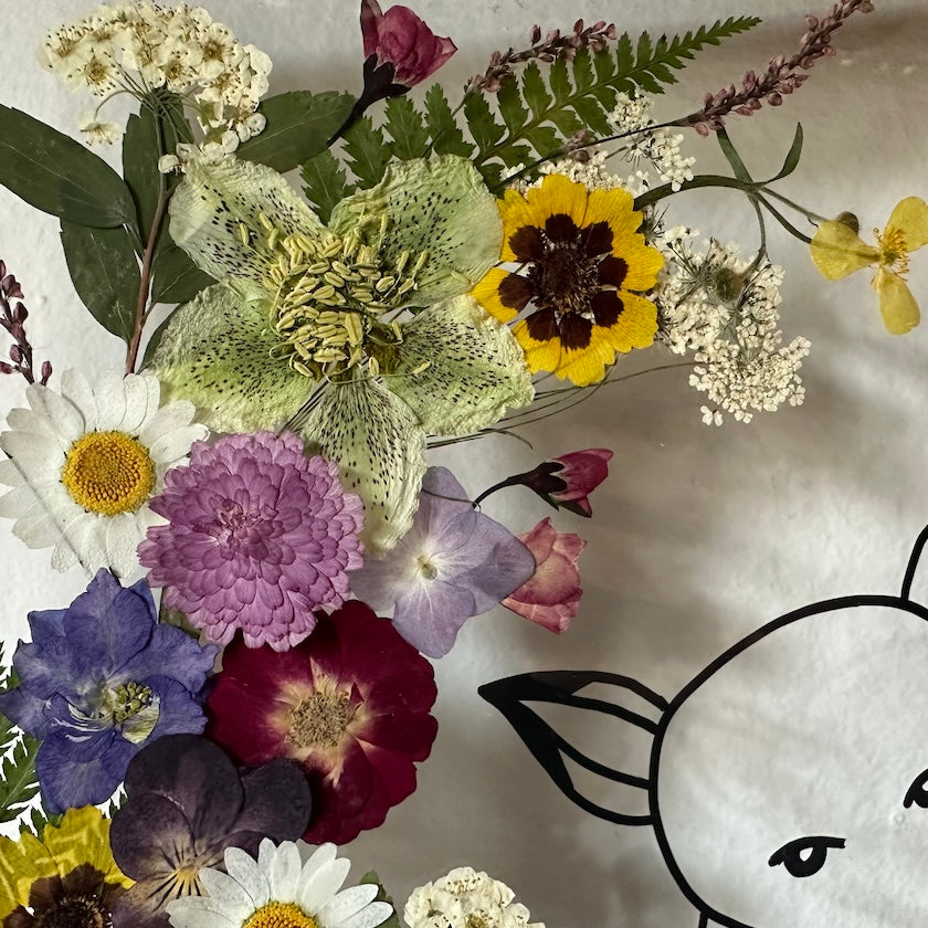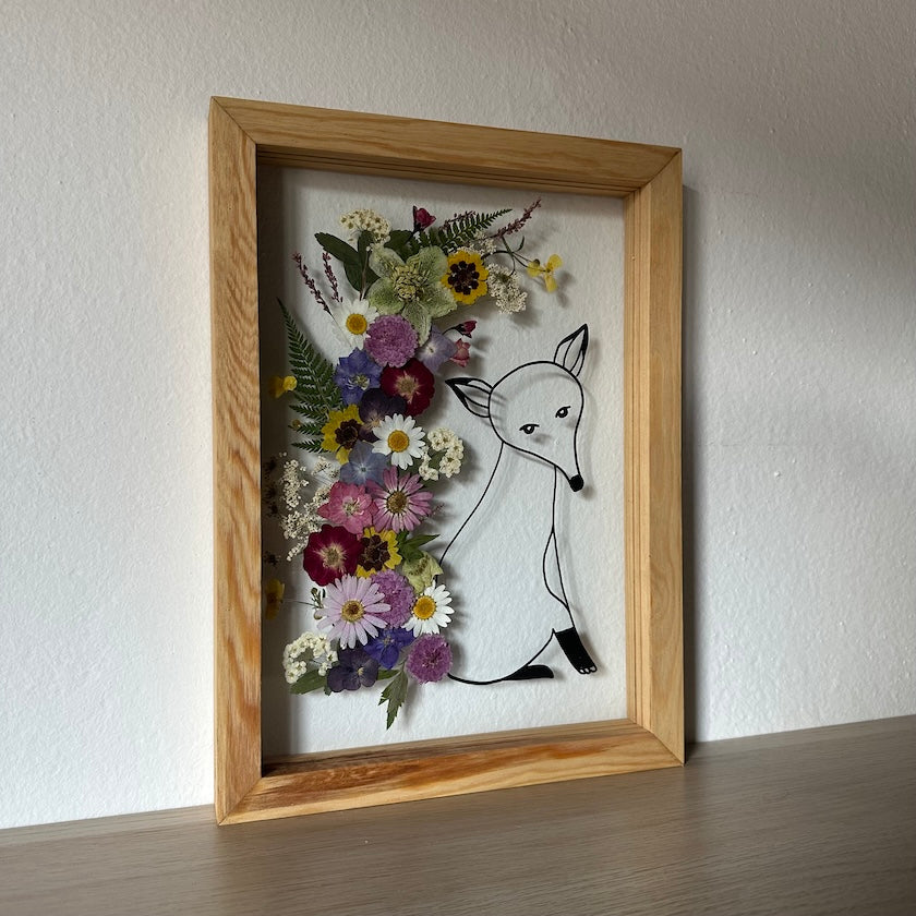 Květinový ručně vyrobený obraz s ručně nakreslenou siluetou zvířátka. Liška s rozkvetlým ocasem z pravých květů zahřeje u srdce každého milovníka zvířecí a květinové říše. Pro malé i velké.