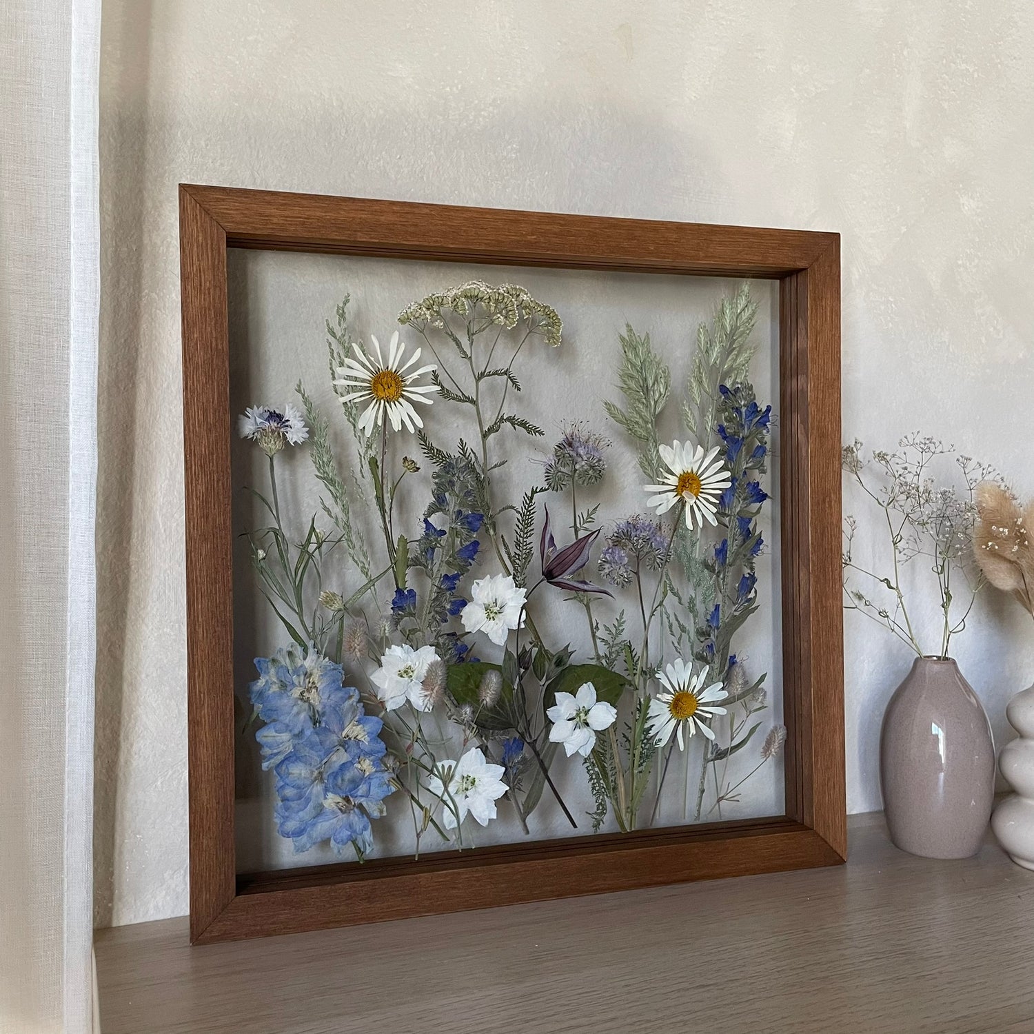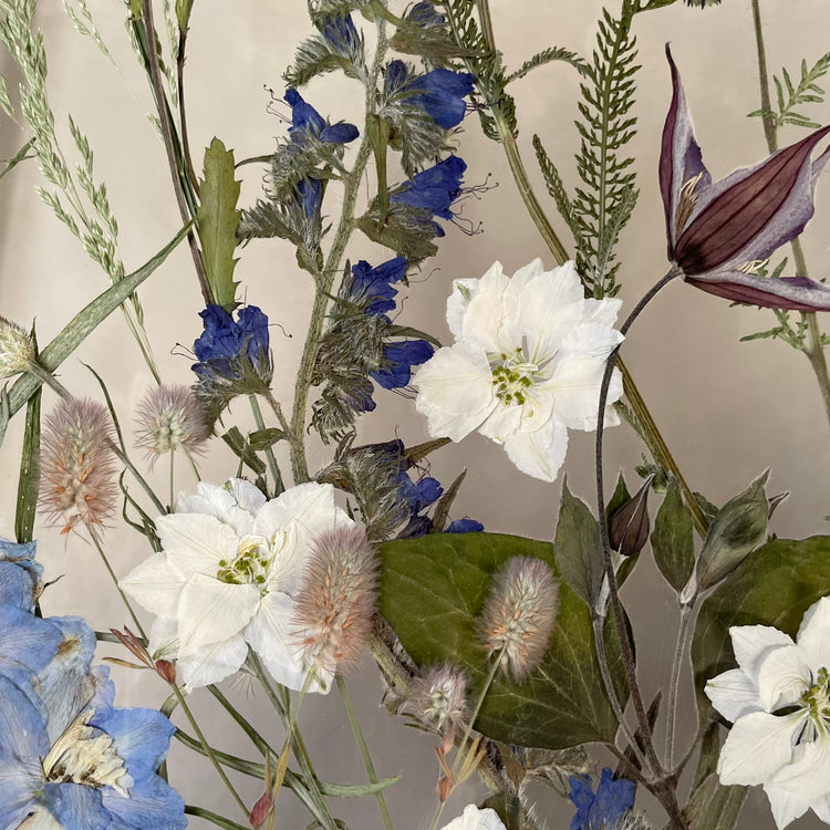 Použité květiny a rostliny jsou skutečné, ručně sbírané a šetrně lisované, aby si zachovaly svou přirozenou strukturu, jemnost i barevnost. 🌿 Následně jsou s citem aranžovány do jedinečné kompozice – každý obraz je originál, žádné dva kusy nejsou stejné.