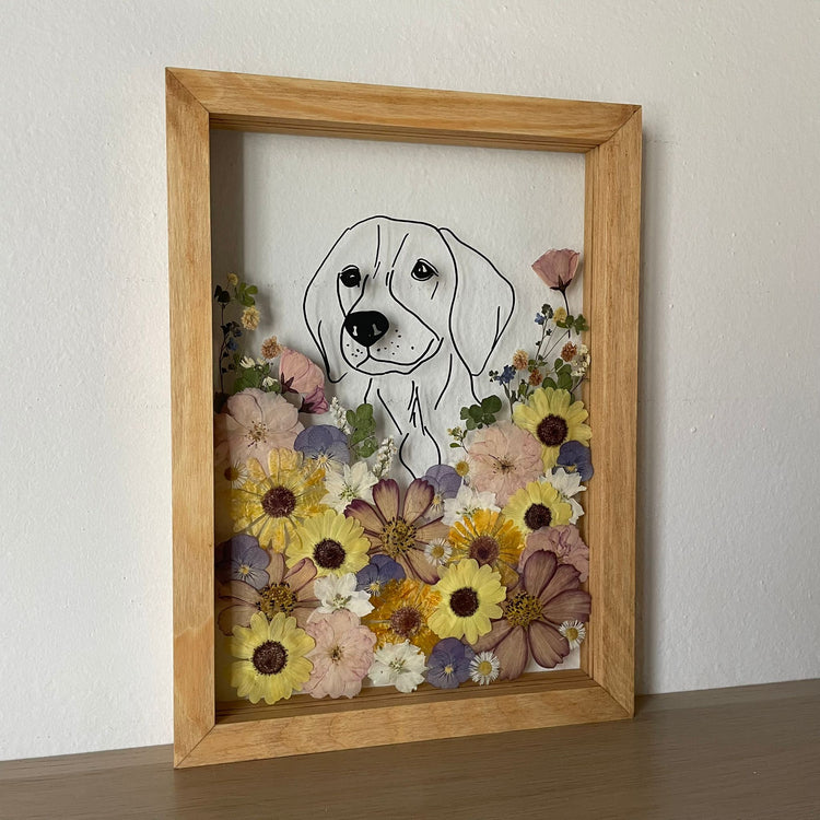 Květinový ručně vyrobený obraz s ručně nakreslenou siluetou zvířátka. Pejsek z pravých květů zahřeje u srdce každého milovníka zvířecí a květinové říše. Pro malé i velké.