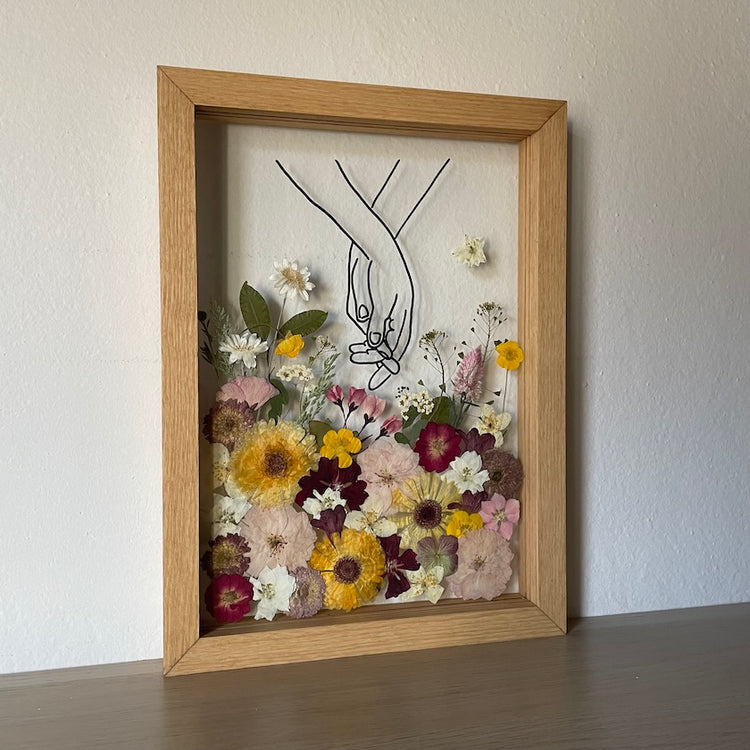 Květiny jsou zasazeny mezi skla a doplněny ručně vyráběným dřevěným rámem, který vzniká přímo v naší dílně. 🪵