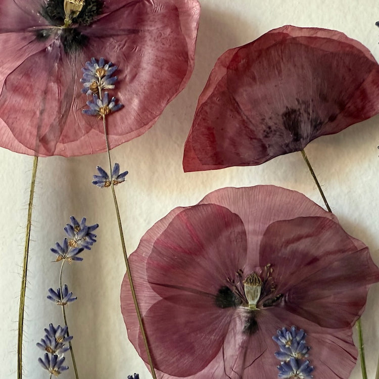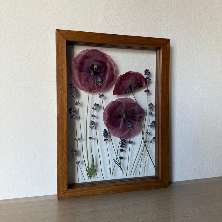 Květinový ručně vyrobený obraz s květy máků a levandule, které rostou ze středu obrazu.