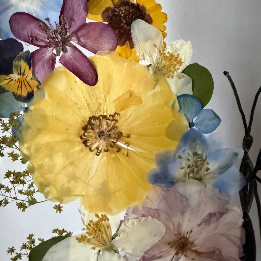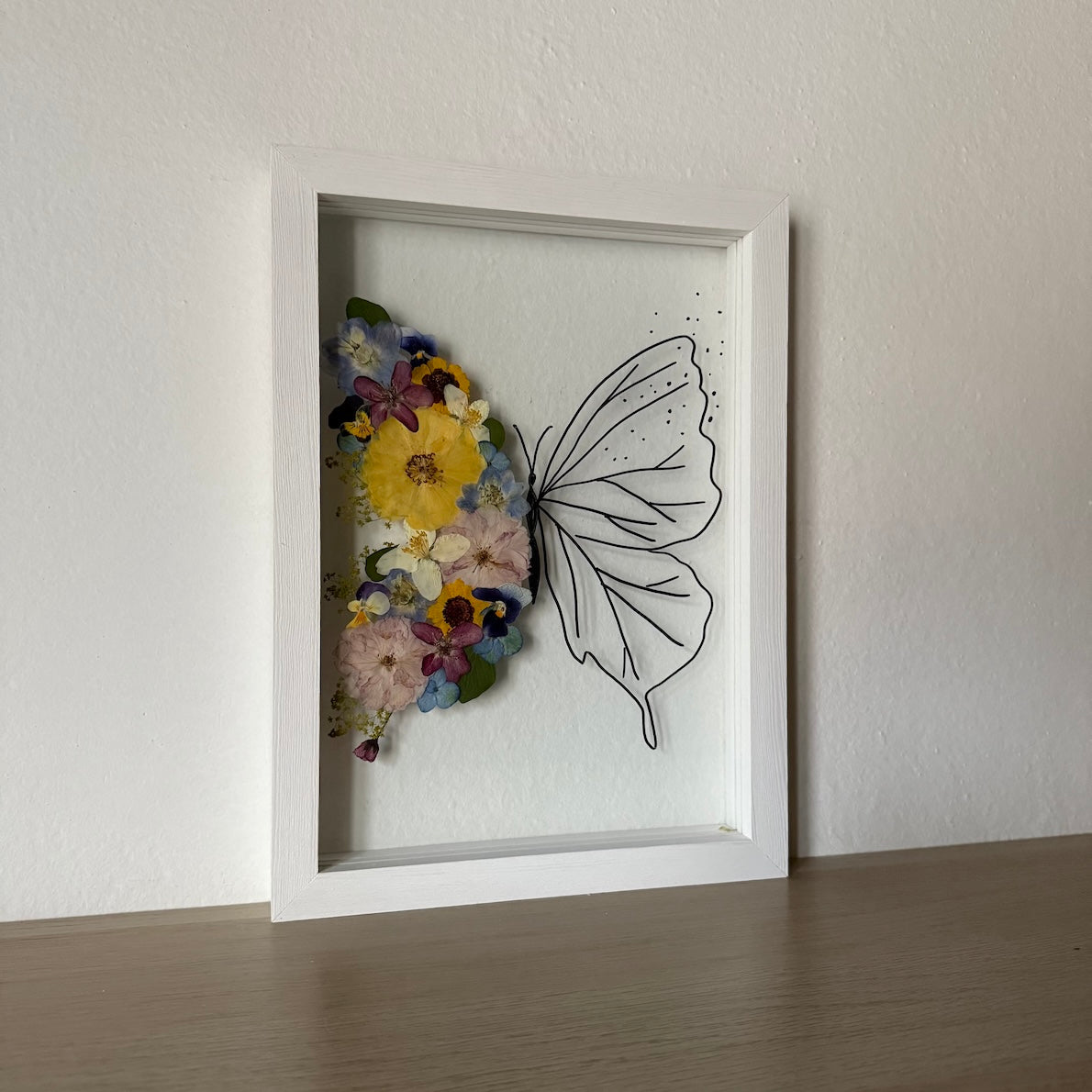 Květinový ručně vyrobený obraz s ručně nakreslenou siluetou zvířátka. Motýl z pravých květů zahřeje u srdce každého milovníka zvířecí a květinové říše. Pro malé i velké.
