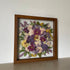 Květinový ručně vyrobený obraz s květy ve fialových, modrých a žlutých barvách, které rostou ze středu obrazu. Mezi květy najdete krásenky, květy třešní, hortenzie a mnoho dalšího.