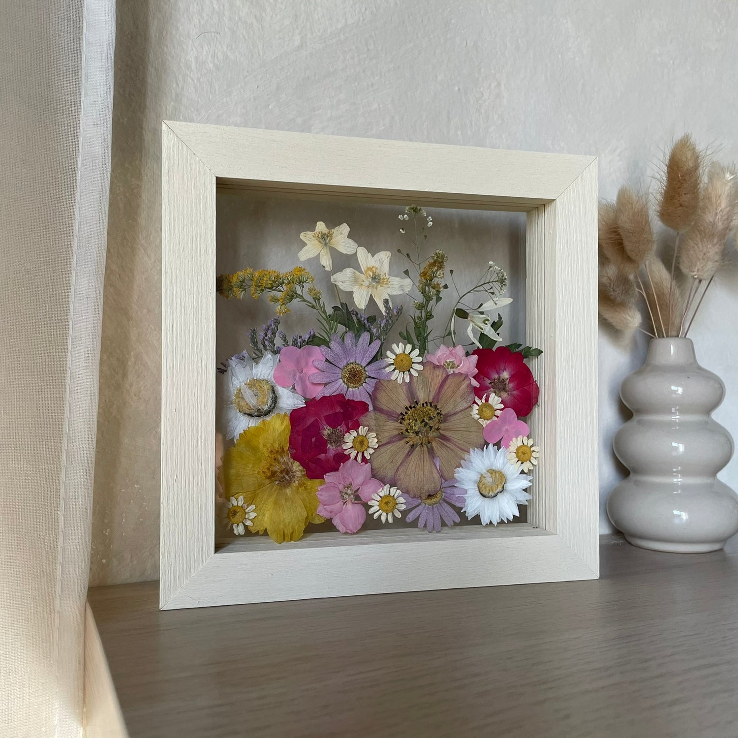 Květiny jsou zasazeny mezi skla a doplněny ručně vyráběným dřevěným rámem, který vzniká přímo v naší dílně. 🪵