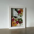 Květinový ručně vyrobený obraz s květy v červených, bílých a oranžových barvách, které rostou z rohů obrazu. Mezi květy najdete růže, krásenky, hortenzie a mnoho dalšího.