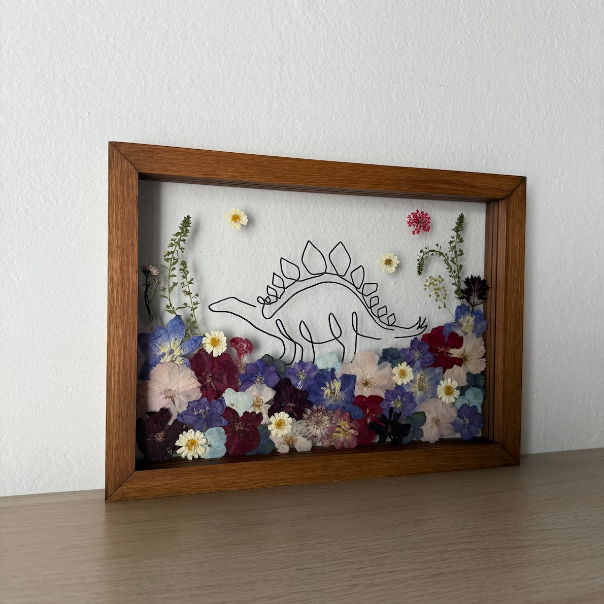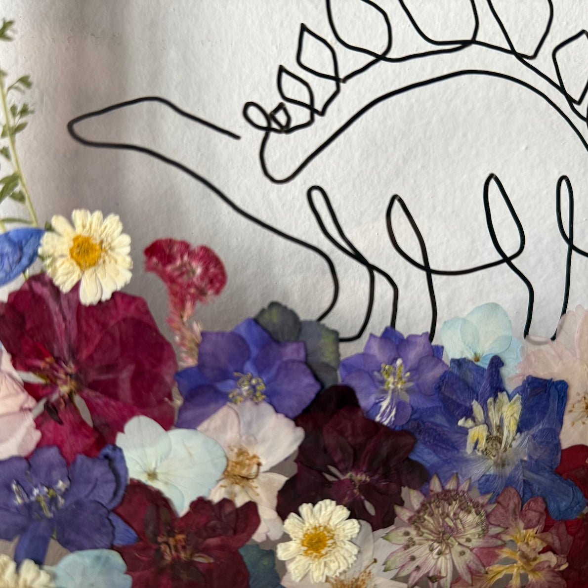 Květinový ručně vyrobený obraz s ručně nakreslenou siluetou zvířátka. Dinosaurus na rozkvetlé louce z pravých květů zahřeje u srdce každého milovníka zvířecí a květinové říše. Pro malé i velké.