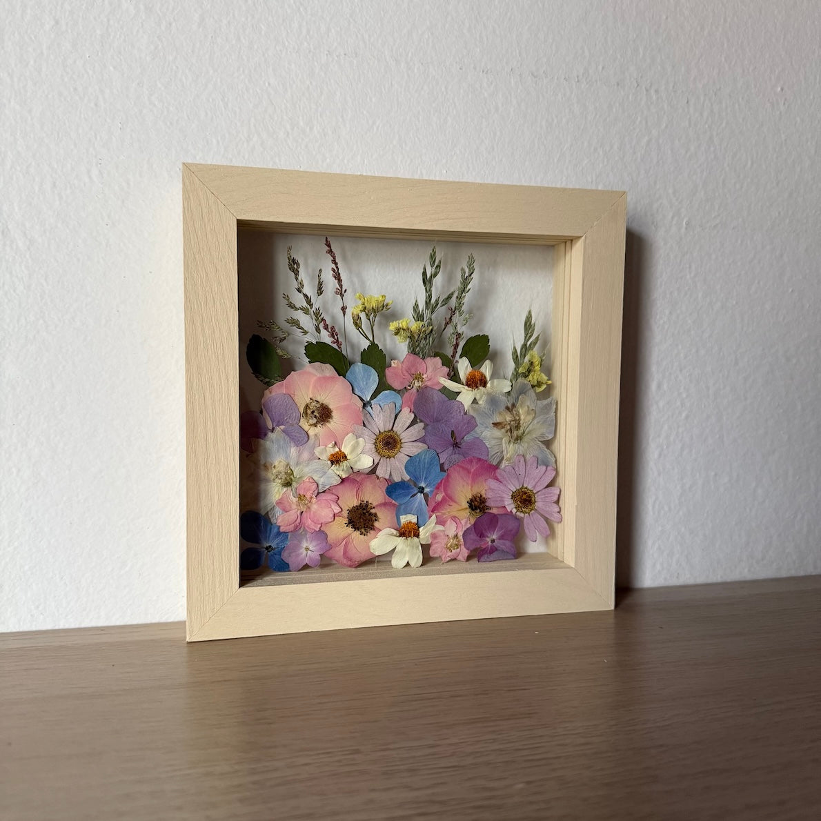 Květiny jsou zasazeny mezi skla a doplněny ručně vyráběným dřevěným rámem, který vzniká přímo v naší dílně. 🪵