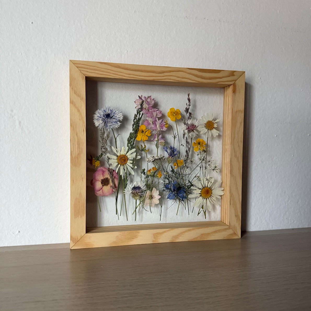 Květiny jsou zasazeny mezi skla a doplněny ručně vyráběným dřevěným rámem, který vzniká přímo v naší dílně. 🪵