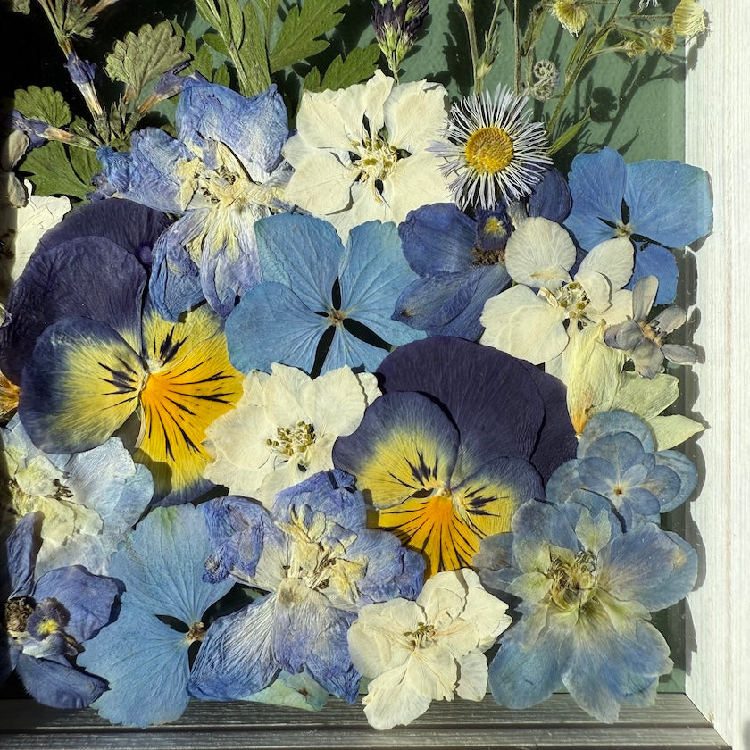 Květinové ručně vyrobený obrazy s květy v modrých a bílých barvách. Mezi květy najdete hortenzie, ostrožky, macešky a mnoho dalšího.
