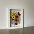 Květinový ručně vyrobený obraz s květy ve žlutých a fialových barvách, které rostou ze středu obrazu. Mezi květy najdete kopretiny, krásenky a mnoho dalšího.