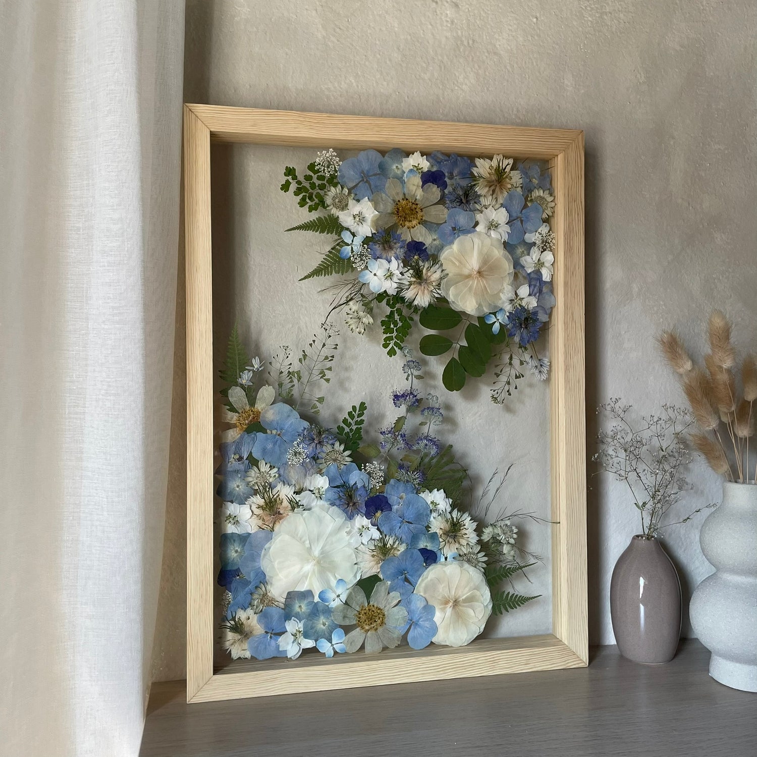 Použité květiny a rostliny jsou skutečné, ručně sbírané a šetrně lisované, aby si zachovaly svou přirozenou strukturu, jemnost i barevnost. 🌿 Následně jsou s citem aranžovány do jedinečné kompozice – každý obraz je originál, žádné dva kusy nejsou stejné.