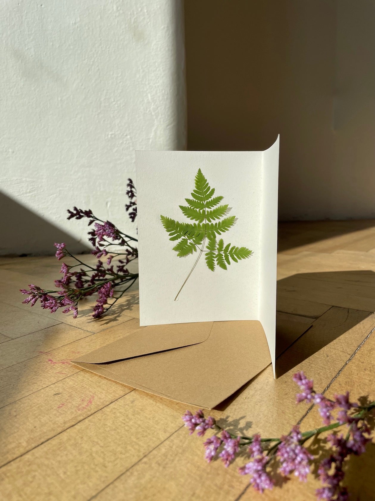 Potěšte své blízké květinovým přáním s pravou vylisovanou kapradinou umístěnou uvnitř přání z přírodního tvrdého papíru. Přední i druhá polovina přání je čistá pro napsání vzkazu od srdce. Kapradiny mohou být různého druhu. Darujte jej spolu s obrazem nebo jen tak. ❤️