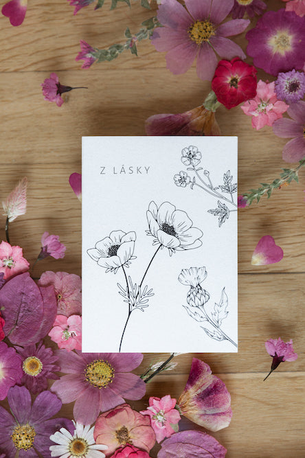 Potěšte své blízké květinovým přáním s nápisem Z lásky vytištěném na přírodním tvrdém papíru. Uvnitř je papír čistý pro napsání vzkazu od srdce. Darujte jej spolu s obrazem nebo jen tak. ❤️