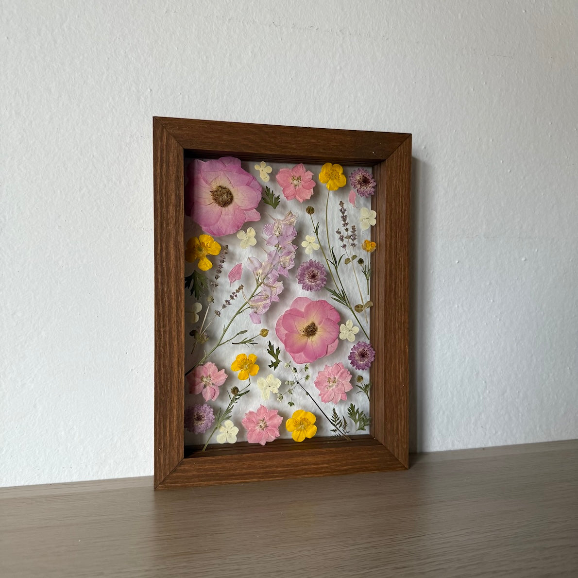 Květiny jsou zasazeny mezi skla a doplněny ručně vyráběným dřevěným rámem, který vzniká přímo v naší dílně. 🪵