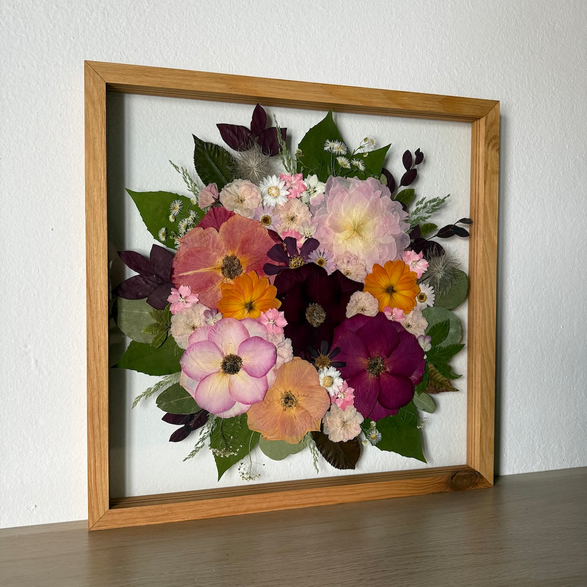 Květiny jsou zasazeny mezi skla a doplněny ručně vyráběným dřevěným rámem, který vzniká přímo v naší dílně. 🪵