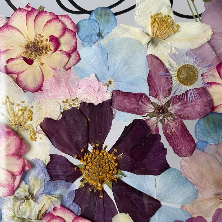 Květinový ručně vyrobený kreslený obraz s květy modrých a růžových odstínů.