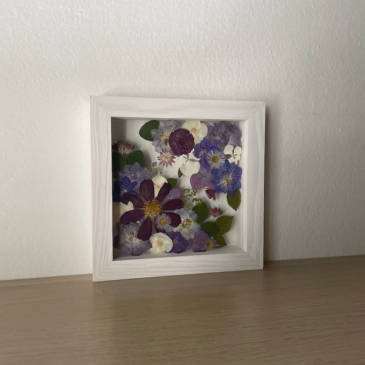 Květinový ručně vyrobený obraz s květy modrých a fialových barviček, které rostou z rohů obrazu. Mezi květy najdete hortenzie, krásenky a mnoho dalšího.