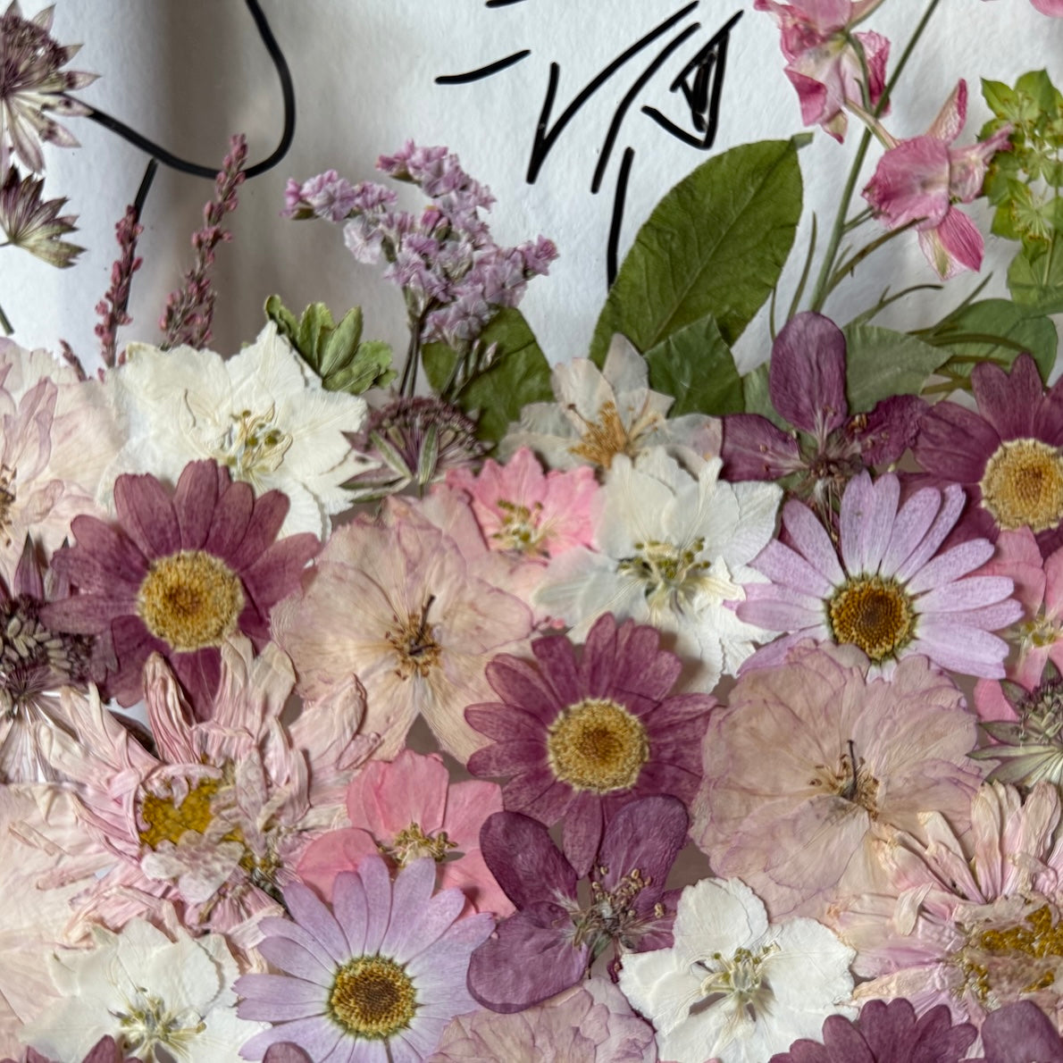 Květinový ručně vyrobený obraz s ručně nakreslenou siluetou zvířátka. Pejsek na rozkvetlé louce z pravých květů zahřeje u srdce každého milovníka zvířecí a květinové říše. Pro malé i velké.