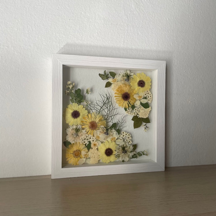 Květinový ručně vyrobený obraz s květy ve žlutých a bílých barvách, které rostou z rohů obrazu. Mezi květy najdete měsíčky, jasmín a mnoho dalšího.